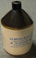 whiskey jugs. Shortly after he moved his Lexington offices once again, this time to Fourth Street near Main, the latter soon to be known as Louisville’s “Distillery Row.”Probably reflecting the great care McKenna took with his product, his whiskey proved to be very popular. In 1883 he built a brand new brick distillery. It had the capacity to make three barrels a day. Testimonials from recognized figures assisted sales. A doctor named Dudley Reynolds was quoted saying: “H McKenna’s whiskey is the purest and best I have ever seen.” By the 1890s the Irishman’s Old Line Sour Mash Whiskey was being sold throughout the United States. Although McKenna never officially called it “bourbon,” that is exactly what it was. Even his liquor containers were notable, including Albany slip jugs with his label “scratched” into the glaze, two of them shown here.